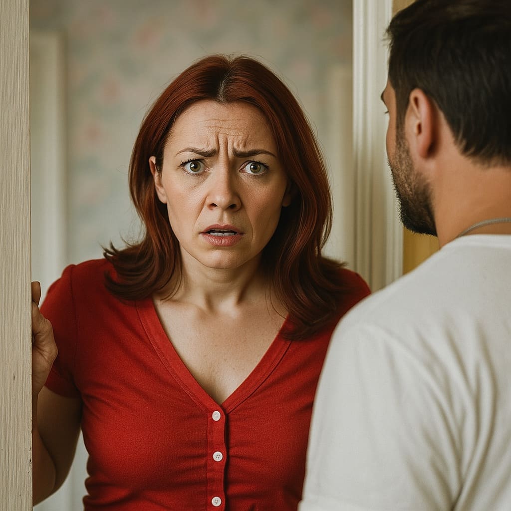 В полутьме комнаты, где мягкие тени играют на стенах, она стоит, словно сражаясь с новыми откровениями. В её глазах читается целый роман — и трагедия, и комедия жизни. В красной майке, как в боевых доспехах, она готова к правде, к катарсису любви и ненависти. Его силуэт — безмолвный символ встречного бури из слов и эмоций. Стены, мозаикой обоев, как рама картины, заключают это малое, но значительное пространство, где происходит драма, знакомая каждому — встреча взглядов, встреча судеб, неловкое молчание на пороге перемен. Каждый вздох — перерыв между сценами, пауза в мелодии совместной жизни.