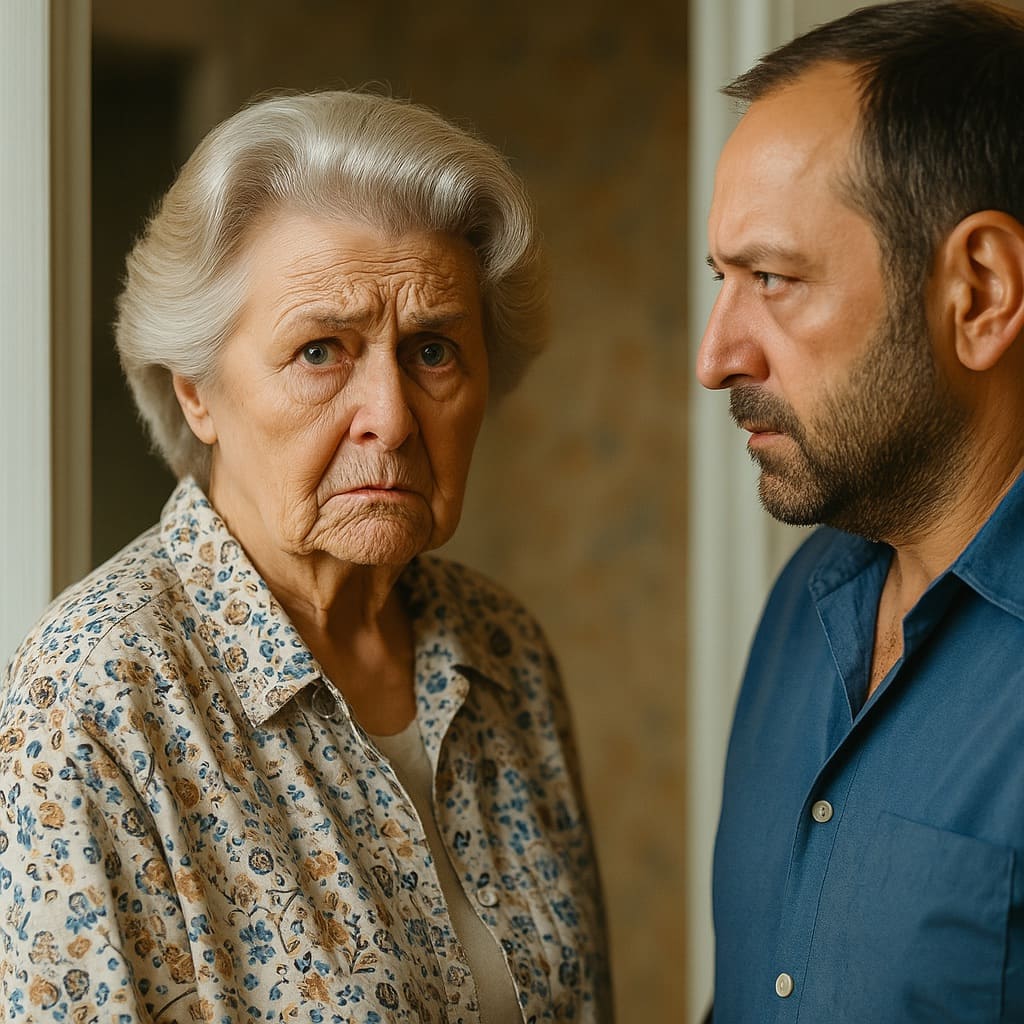 Время замерло в тишине, превращая мгновение в вечность. Их взгляды переплетены, словно две реки, которые неизбежно сольются, но никогда не потеряют своей особенной глубины. Старушка, в платье с цветочным узором, носительница воспоминаний, хранит в себе тысячу историй, каждая из которых могла бы заполнить том романа. Её глаза, тусклые, но полные вопросов, обращены к мужчине, стоящему рядом. Он, в синей рубашке, олицетворяет сегодняшнее, напряжённое, с ноткой неосторожной правды. Между ними плывет невидимый диалог, шепот сердца, который слышен только им двоим. Это сцена наполнена молчаливой нежностью и горечью, эхо прошлого, стремящегося к умиротворению. Наверное, это разговор о том, что пролетело, и том, что еще ждет их впереди, словно листопадный ветер, приносящий запахи осени в разгар лета.