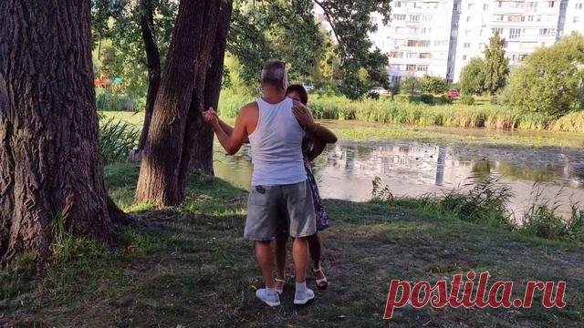 Летний полдень, озарённый мягким светом и ароматом разогретой травы. На фоне густо-зелёных деревьев и старого пруда, отражающего лепет воды и нежные тени, словно солнечный зайчик, мелькает пара. В этом танце есть что-то негромкое, почти забытое. Мужчина в белой майке и шортах, как странник времени, перемещается по невидимым траекториям дней, открытых книг и недосказанных строк. Женщина, словно лучик солнца, скользит рядом, хитрым узором история и будет сплетаться, пока рябь воды отзывает о прошлом. Дома на заднем плане губят анонимными анклавами бетонного мира, но здесь, под деревьями, жизнь насыщена мелодией, дарующей лёгкость воспоминаний детства. Где-то вдалеке слышен голос только что осевшего на траву светила, которое решило заглянуть в сердце и оставить там вечный след. Камень, вода, дерево — всё сплетается в этом неповторимом хоре, где каждый шаг отделён от другого человечностью молчания.