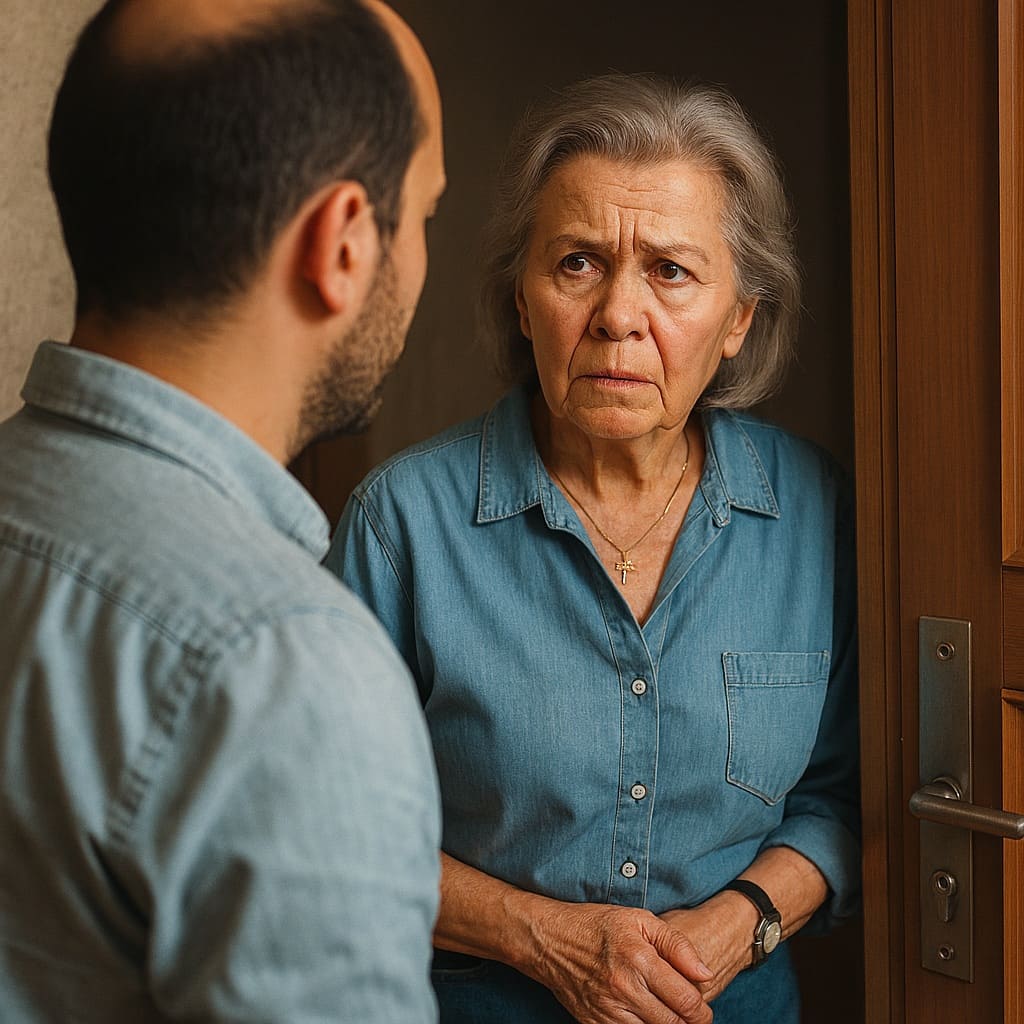 На пороге времени остановилось мгновение, проникнутое светом вечернего дня. Женщина, закутанная в безмолвие стальных кудрей, пронзает взглядом незнакомца. Её руки, украшенные сетью морщин, прикасаются друг к другу, словно находя в себе опору. Мужчина напротив, словно выходец из другой эпохи, ищет пути к её сердцу, но правильные слова ускользают, как песок сквозь пальцы. Её глаза говорят больше, чем можно выразить словами; это диалог двух миров. Шёпот за кадром добавляет драматичности, как если бы это была сцена из фильма, где каждая пауза значима, каждое движение руки — эмблема уязвимости и доверия. Неразрывная связь текста и образа создает ощущение, что здесь решается нечто большее, чем простой дружеский визит — это разговор душ, где тихий голос реальности звучит отголоском внутри.
