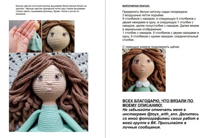 Свет лился сквозь занавески, наполняя комнату мягким сиянием, где на первой скрипке играло крючком связанное чудо — кукла с глазами, полными тепла и ожидания. Её волосы, словно волны янтарного моря, аккуратно обрамляют чудесные черты, говоря о заботе и времени, вложенном в каждую петлю. В этих прядях живёт воздух морских ветров и шёпоты скандинавских легенд. Инструкция, как магический свиток, раскрывает тайны создания этой текстильной феи, добавляя повествованию нотки мистики рукоделия. На словах луны держится обещание нового творчества, невидимых рукотворных миров, где каждый стежок пронизан нежностью мастера. Кукла — это не просто вещь, это маленькое амулетное сердце, готовое подарить уют вечерами. Не забыть бы рассказать миру о своём творчестве, ведь в каждой детали шьётся душа, ждущая отклика в лице таких же творцов.