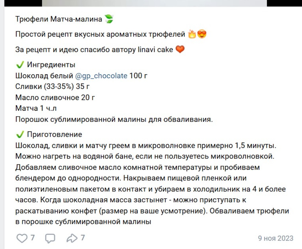 Вечерний свет мягко касается столешницы, где неспешно разворачивается магия кулинарного искусства. Словно страницы гастрономического романа, ингредиенты рассказывают свои истории. Белый шоколад, как снежная королева, ждет своего выхода, рядом сливки, облаченные в оправу утреннего росы. Масло, словно художник, готовит палитру для создания шедевра. Матча — древний зеленый дракон, привносит нотки Востока. Порошок сублимированной малины, как поэзия летнего сада, завораживает и вызывает улыбки. В микроволновке создается союз, который приручает стихию в сладость. В этих трюфелях - кусочки истории, где благодарность автору звучит как музыкальная нота в конце симфонии. И этот рецепт, как секретный ключ, раскрывает дверь в мир вдохновения и лакомства. Глаза скользят по текстуре бумаги, воспоминания лавиной накатываются — всё это соединяется в гладкой текучести шоколада, от которого нельзя оторваться.