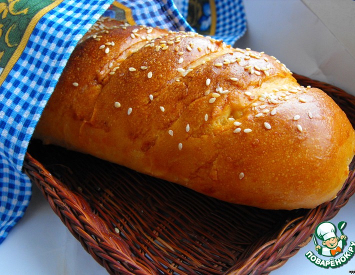 - Все продукты закладываем в ведерко хлебопечки согласно инструкции, включаем режим "Тесто" и доводим до готовности. Или замешиваем тесто обычным способом. Даем подойти (тесто должно увеличиться в два раза). Выкладываем тесто на стол и начинаем формовать сам батон. Сначала раскатываем скалкой тесто в пласт. Затем начинаем сворачивать тесто в рулет, но с небольшой тонкостью. После каждого полного оборота теста при скатывании прищипываем край рулета к пласту теста пальцами и, притом, плотно. И так надо сделать до конца свертывания всего рулета. При сворачивании не нужно скатывать тесто очень туго и в то же время не нужно допускать пустот между слоями теста. Края рулета тоже нужно подровнять, чтобы не было разных неровностей и выпуклостей, и не попадал лишний воздух. Получается аккуратненький батончик в виде колбаски. Батон складывается таким образом, чтобы добиться однородного и ровного мякиша внутри готового хлеба. Мякиш становится плотным, ровным, но с хорошей текстурой. Сформованный таким образом батон укладываем на противень (застеленный пергаментом) швом вниз. Ставим противень с тестовой заготовкой в духовку на расстойку при температуре 30*С, пока заготовка не увеличится вдвое. После этого на заготовке делаем поперечные надрезы, смазываем заготовку взбитым желтком с 1 ст. л. воды, посыпаем белым кунжутом. На батоне я стала делать надрезы после расстойки тестовой заготовки, тесто при этом сильно не расползается по линиям надрезов. Надрезы делать нужно для того, чтобы при расстойке и выпечке заготовка не стала растрескиваться по другим местам и особенно внизу. Выпекать батон ставим в духовку при температуре 200*С и, когда корочка зарумянится до красного цвета (примерно минут 7-10), убавляем до 170-180*С и доводим до готовности (еще минут 25). Затем ставим хлеб на решетку до полного остывания. Приятного аппетита!!!