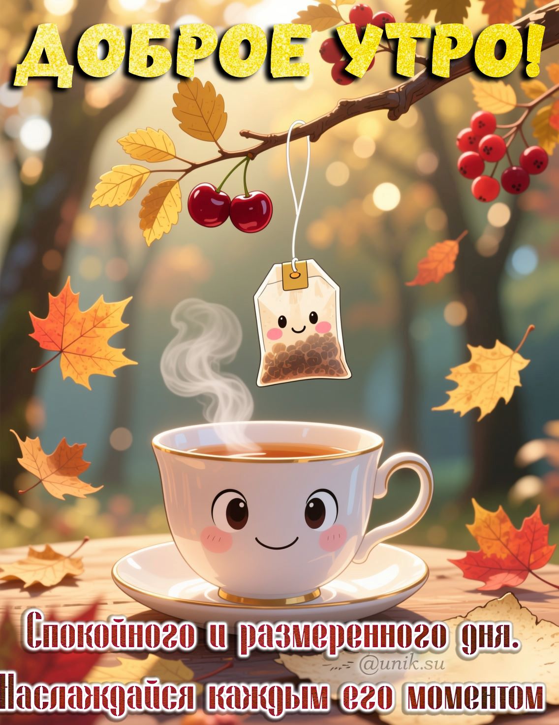 Утро просыпается в легкой дымке пара, поднимающегося из чашки с чайным лицом, светящейся добрым дружелюбием. Листья, словно золотистые лепестки мечты, танцуют в воздухе, окаймляя ветви, увенчанные алыми бусинами вишен. Весь этот осенний симфонический оркестр звучит в унисон, приветствуя новый день. Мелодия световых бликов и игра света на керамической поверхности чашки превращают каждый глоток чая в мгновение спокойствия и размеренности. Надпись, дрожащая в воздухе, как эхо, шепчет о гармонии и наслаждении каждым мгновением, предлагая отпить из источника утренней радости. Сцена, словно пожелающая каждому отправиться в путешествие по своему дню с благодарностью в сердце, наполняется цветом и теплом, как память о лете, которую мы уносим через порог осени.