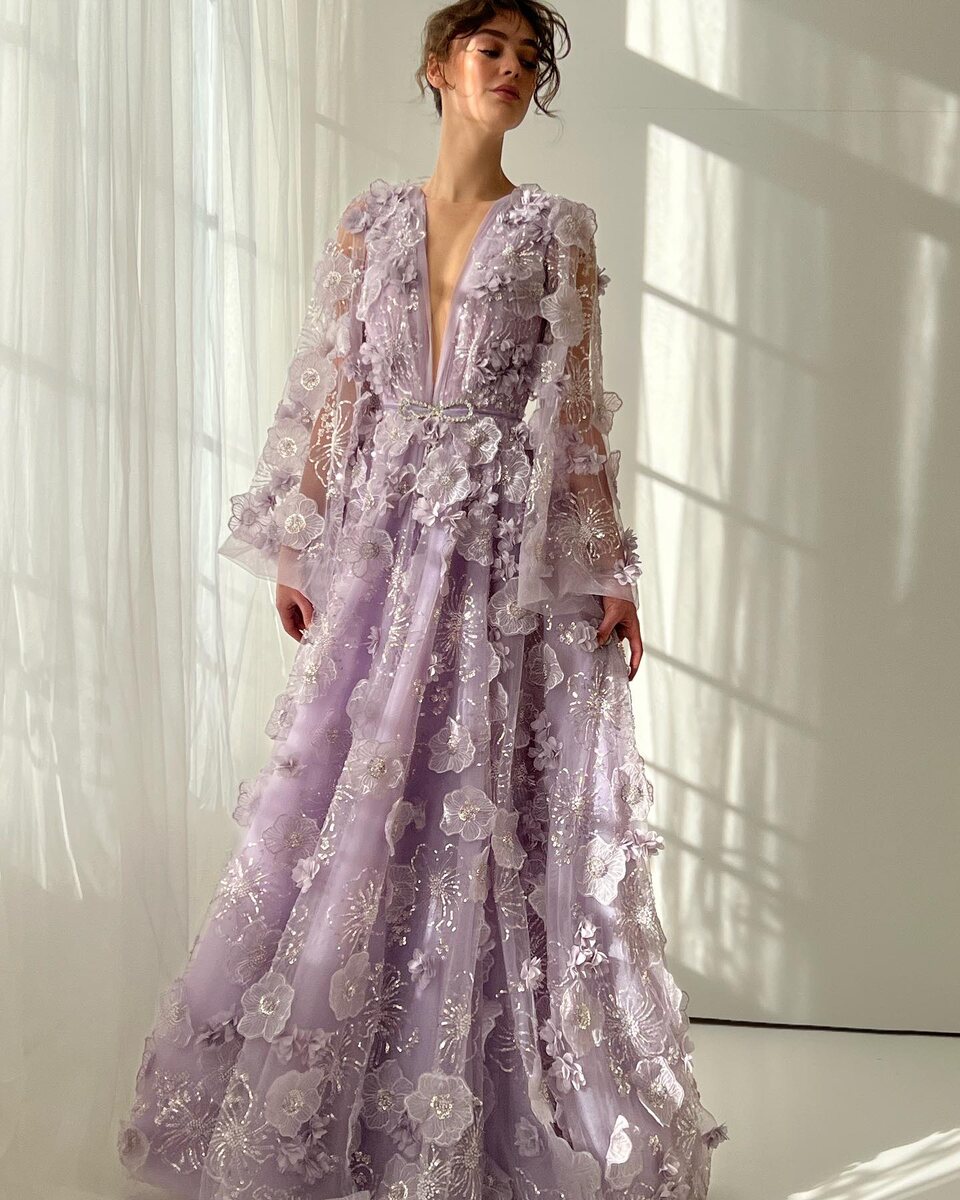 Свет проникает сквозь тонкие занавески, создавая призрачный рисунок на стенах, словно сама комната дышит вместе с женщиной в волшебном платье, лишённом времени и эпохи. Воздушное облако лиловой органзы обнимает её фигуру, как будто сотканное из утреннего тумана и затейливых узоров, исчерченных рукой мастера. Образ уносит в мир фантазий и весенней грезы, где каждая деталь, каждый невидимый стежок рассказывает о вечной красоте и хрупкости. Её взгляд устремлён в неведомую даль, как будто она жаждет ускользнуть из оков обыденности в нескончаемую сказку. Это платье словно вздох поэтов, зарифмованный в ажур и шелковые оттенки, в которых скрыто множество историй и тайн. В комнате стоит безмолвие, нарушаемое лишь мгновением света, запечатлевшим момент изящной мглой. В этом мире платков, завитков и переплетений нет места шуму — лишь тихий шёпот Востока, скрытый в складках и тенях.