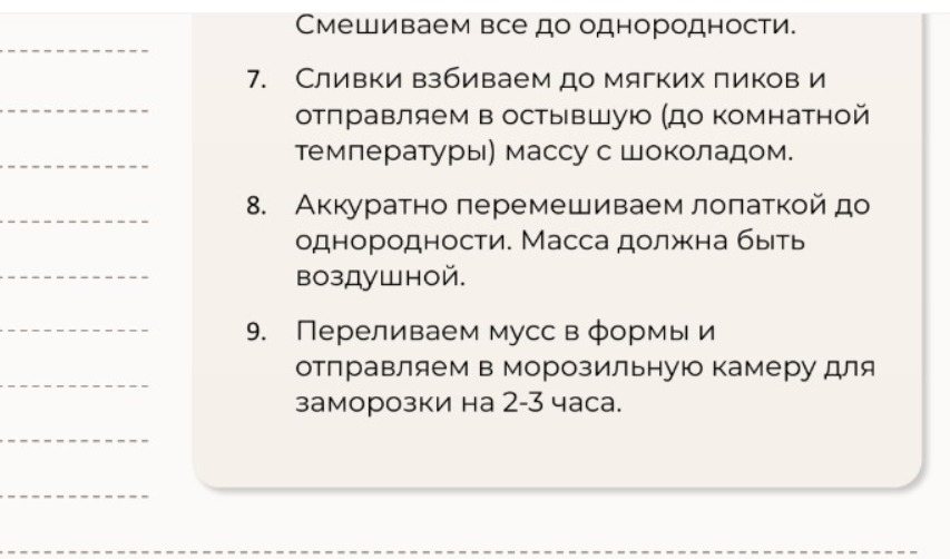 Тихий шёпот кухонной алхимии разносится по светлой кухне, превращая простые ингредиенты в магическую симфонию вкусов. Листы бумаги, словно страницы кулинарной повести, ведут читателя сквозь процесс создания — начиная с нежной мелодии взбивающихся сливок и до таинственного трансформации шоколадной массы в воздушное облако мусса. Каждое движение ложки, каждый взмах венчика — как мазки виртуозного художника, создающего шедевр. Здесь нет места спешке: текстура, легкость, изящная прохлада морозильной камеры становятся персонифицированными проводниками в мир гастрономической благодати. Холодные кристаллы плена трёхчасового ожидания держат ангельское лакомство в ожидании торжественного выхода. В этой тишине слышны лишь звуки сердца, замеревшего в сладком ожидании результата.