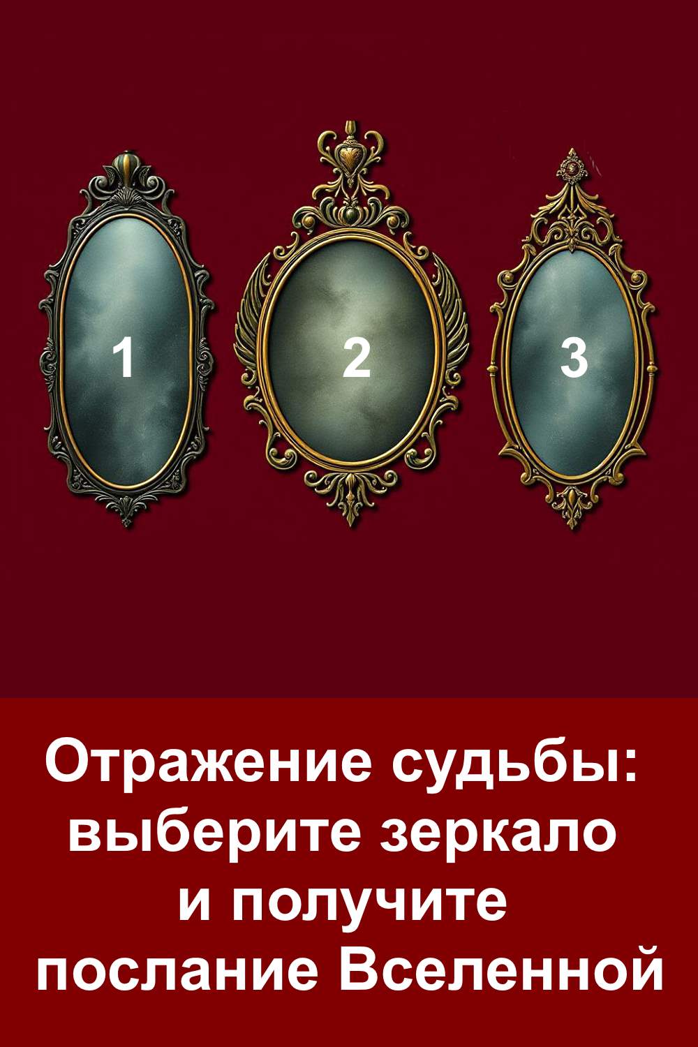 Величественные зеркала, будто бы из потерянного дворца фантазий, перетекают в сознание наблюдателя, создавая иллюзию, что от каждого из них исходит таинственное сияние вечности. Три обрамления, подобные сказочным аркам, манят своей невидимой глубиной. Как в сказках братьев Гримм или волшебных рассказах Андерсена, здесь переплетаются нити прошлого и настоящего, и каждое зеркало предлагает свой путь. Выберите зеркала — шепчут они, будто бы отражают в себе не только образ, но и саму душу. В тишине угадывается голос Вселенной, зовущий узнать неопознанное. Текст, утонувший в рубиновом фоне, отзывается какраинская народная песня, обещая разгадать загадки бытия. Время остановилось, ожидая, когда вы протянете руку к одному из них. И вот, в этом мгновении зреет обещание чуда.