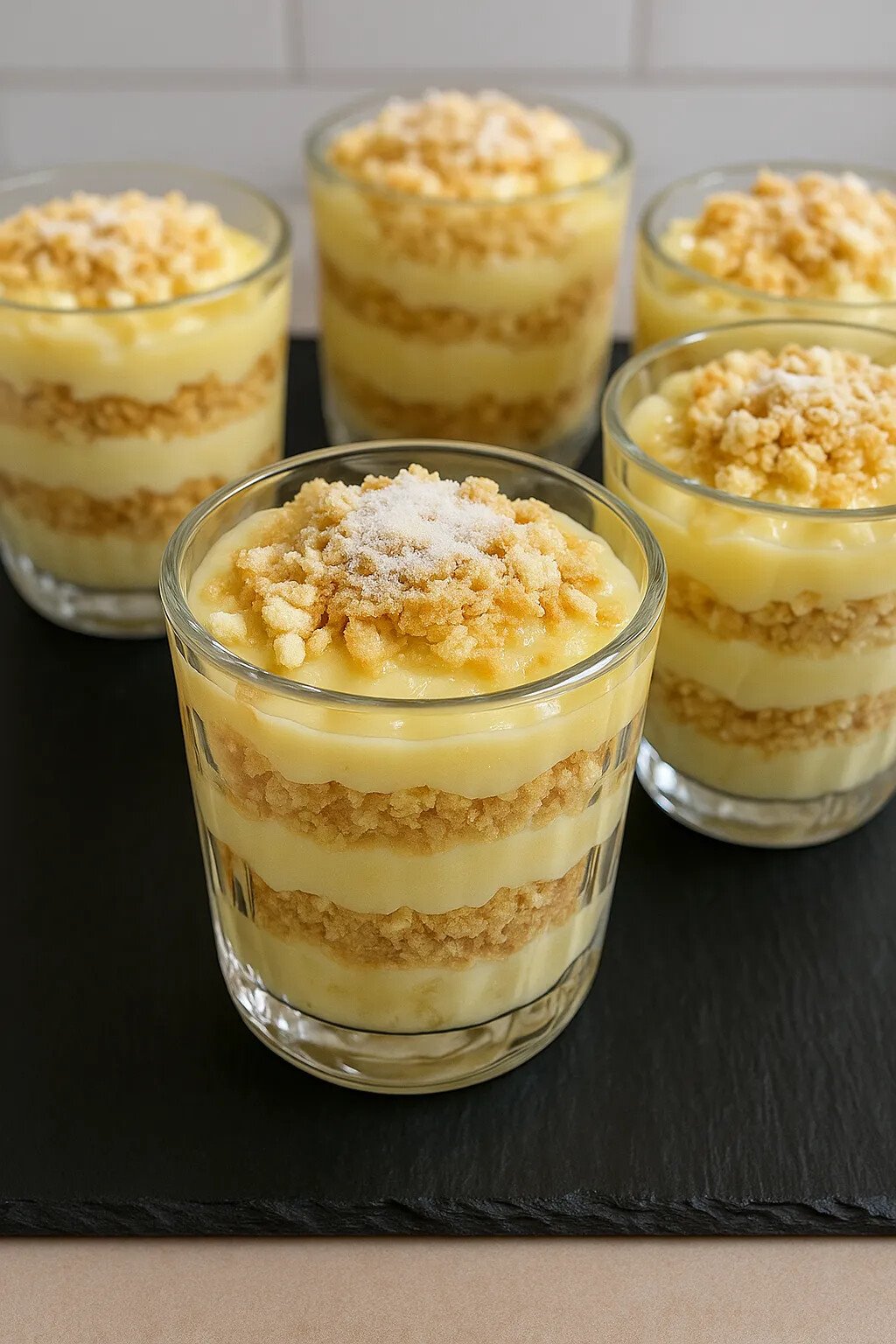 На чёрном, как оливковая ночь, сланце стоят пять скромных стеклянных кубков, наполненных жёлтыми слоями счастья. Это как страницы незримой книги, где за каждым слоем ванильного крема скрываются золотые пески печенья, перемолотого в крошево детских воспоминаний. Эти десерты словно олицетворяют мягкость разговора на тихой кухне, где воображение путешествует между сладкими единицами вкуса. Вам бы захотелось не просто попробовать, а стать частью этой сцены, вдыхая ароматы, которые воплощают в себе не только гурманские прихоти, но и мгновения, когда даже самый обычный вечер становится чем-то особенным. Здесь всё как в балете – баланс вкуса, игра текстур, поэзия цветов в бокале. Этот десерт – не просто десерт, это весь спектр нежности и заботы о себе, маленький ритуал счастья в стекле.