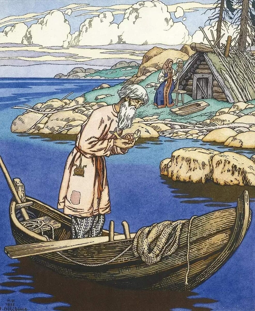 Словно ожившая страница старинной сказки, это изображение притягивает взгляд и уносит в мир, где реальность и фантазия плывут единой рекой. Старик, стоящий в лодке у тёмных вод, склонил голову, будто в неведении, что делать с загадочным уловом. На берегу, утопая в яркой зелени, притаилась изба, из которой встречают его уставшие и любопытные лица. Небо заволакивают облака, похожие на рваную белую шерсть, сплетённую на фоне голубого свода, как символ надежды в каждом переходе. Желтоватые скалы несут эхо прошлых волн, и весь пейзаж дышит историей, тишиной, созерцанием — как будто время застыло, оставив героев в вечном ожидании перемен. Здесь воздух наполнен шёпотом легенд, а свет и тень играют на струнах души, приглашая задуматься о том, что скрыто за горизонтом.