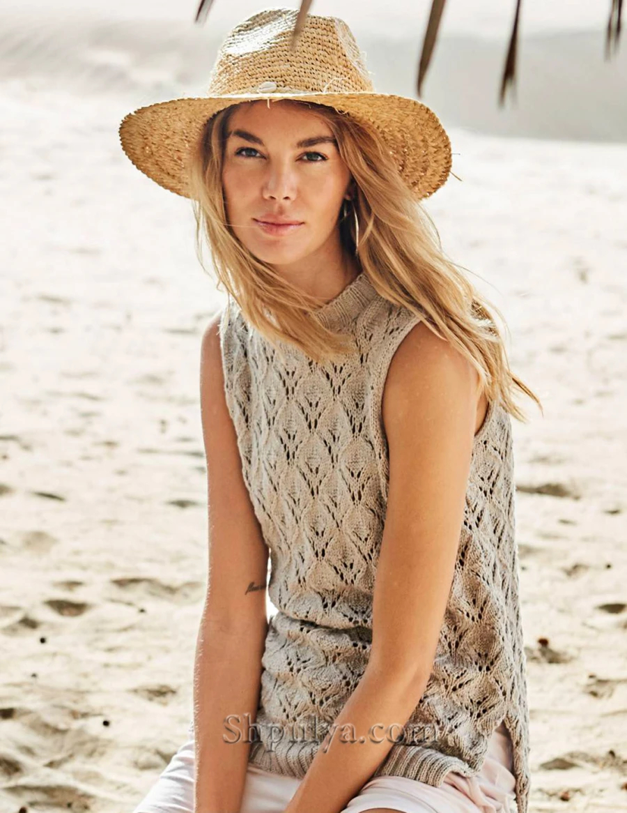 Плотно прилегающая к шее бейка горловины, глубокие проймы, открывающие плечи, и высокие разрезы снизу - изысканная форма этого топа уже сама по себе заслуживает внимания. Добавьте ажурный ромбовидный узор, мягкую пряжу из хлопка с вискозой -и лучшего спутника для отдыха на море вам не найти!