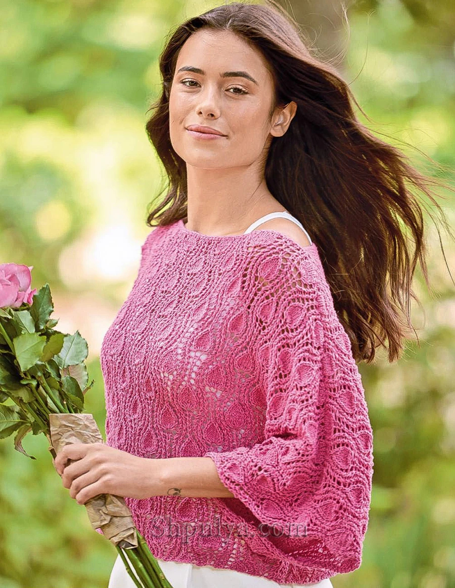 Удивительно удобный пуловер прямого силуэта с широкими цельновязаными рукавами свободно ниспадает от плеч и нисколько не стесняет движений. Пряжа, состоящая пополам из шелка и хлопка, а также ажурный узор в виде листьев помогут пережить любую жару.