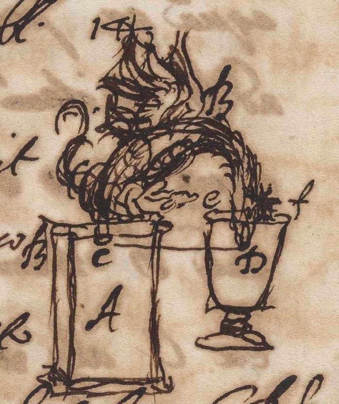 Манускрипт "О спиритизме", 17 век Рисунок дракона из манускрипта 17-го века "О спиритизме" (автор неизвестен), возможно, иллюстрирующий какой-то принцип химии или алхимии, учитывая тематику друг