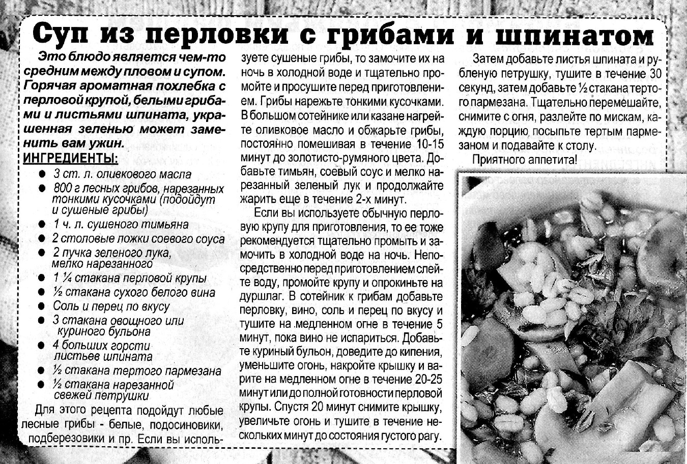Суп из перловки с грибами и шпинатом
