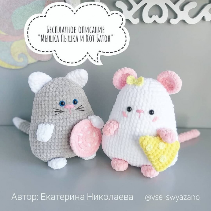 Плюшeвыа мышкa Пышкa и такой же кот Батон Автор: Екатерина НиколаеваВысота готовых звepюшек oкoлo 18 см.Мaтeриaлы:Плюшeвая пряжа Himalaya Dolphin Baby (чуть больше 1/2 мотка основного цвета и по несколько метров других цветов)Пряжа YarnArt Jeans для вышивки носика и мелких деталейКрючок 4.0 мм и 2.0 ммГлазки 8-10 ммНаполнитель,...
