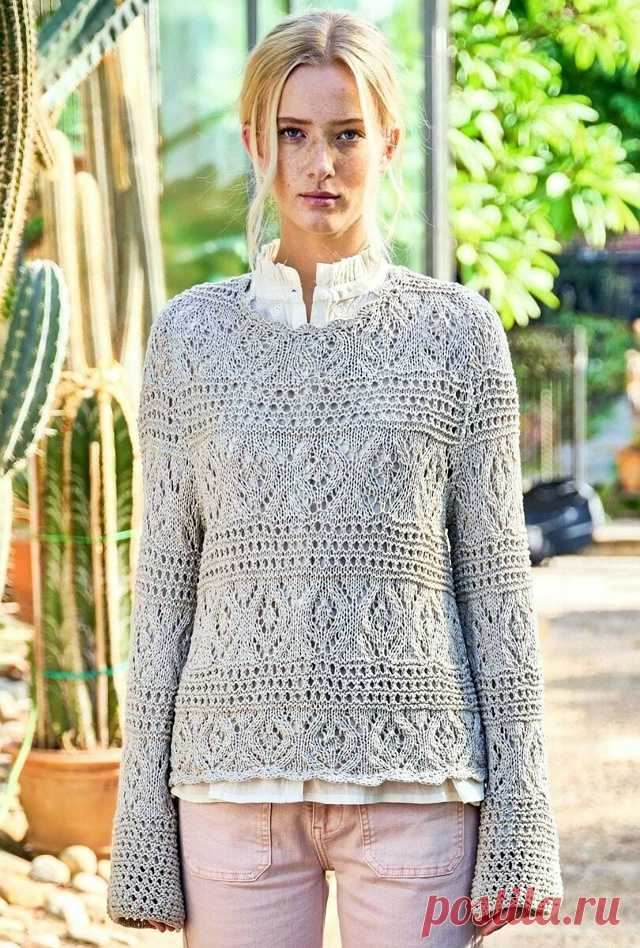 Пост на стене Серовато-бежевый пуловер с фантазийными узорами и фестончатой каймой ♥Европейские размеры: 38/40 (44/46) 50. Российские размеры: 44/46 (50/52) 56. Для вязания нам потребуется 400 (450) 500 г серовато-бежевой (цвет № Fb 14) пряжи LANA GROSSA "Cotton Mélange": 80% хлопок, 20% овечья шерсть; 140 м/ 50 г. Спицы № 5 и крючок № 4,5. УЗОРЫ ♥ Узор со сквозными отверстиями. Нечетное количество петель. 1-й р. = лиц, р...