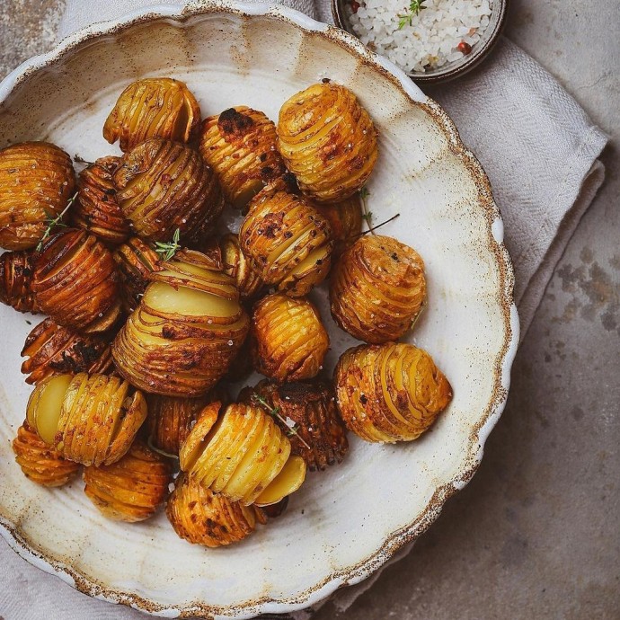 Запеченный картофель Ингредиенты:Мелкий картофель Чеснок Соль Тимьян Розмарин Оливковое маслоПриготовление:1. Картофель хорошо промойте, используя жесткую губку. 2. Надрежьте гармошкой. Чтобы подстраховать себя и не разрезать картофель до конца, используйте палочки для суши или...