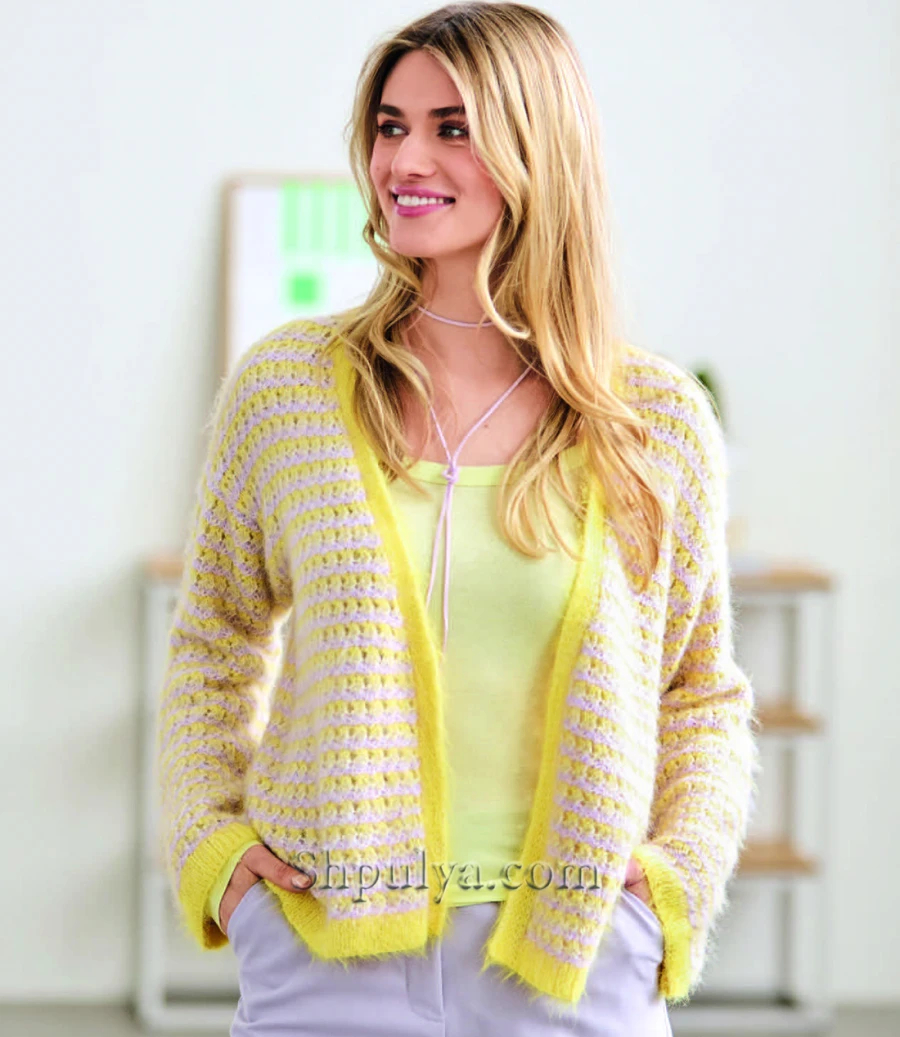 Легкий пушистый кардиган без застежки завораживает своей мягкостью и гармоничной цветовой гаммой, приятной для глаз. Полосатый ажурный узор в однотонной окантовке выглядит скромно, но очень мило.