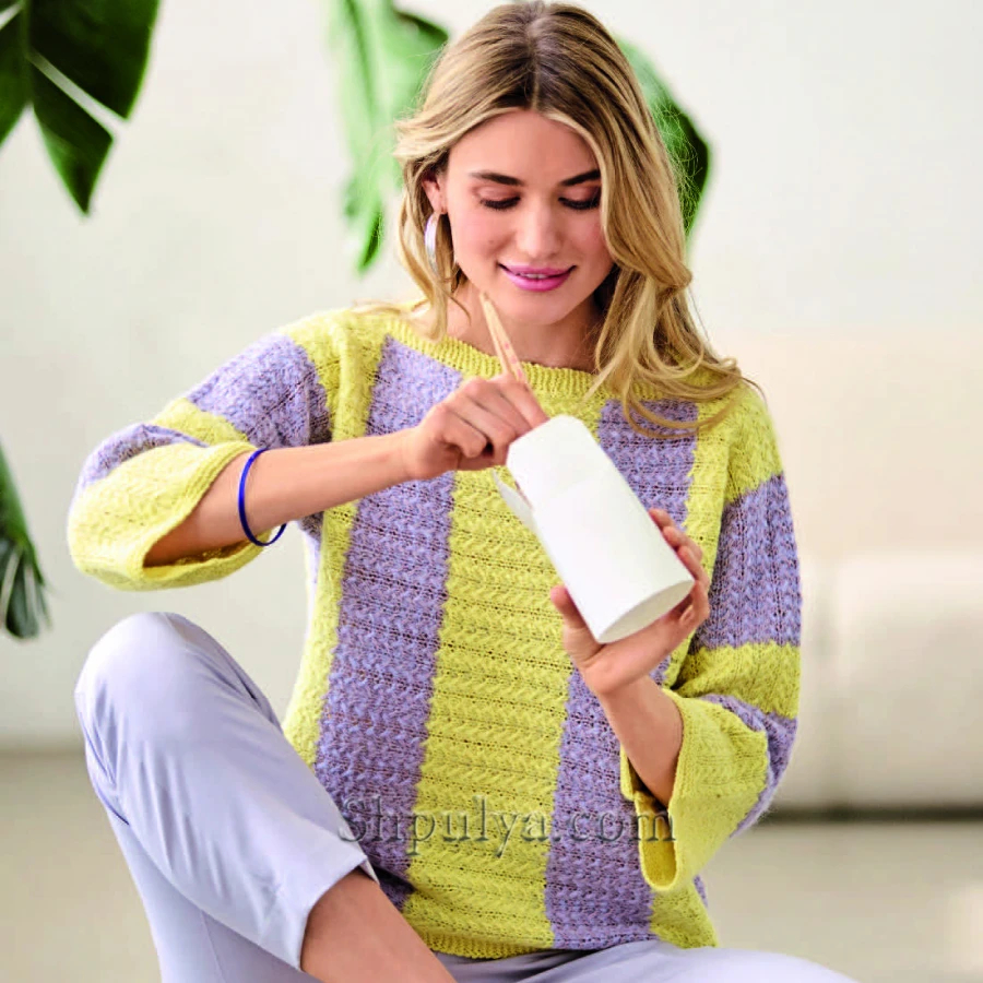 Удачный союз прямых линий и фактурного узора, воздушного хлопка и пушистого мохера -все это вы найдете в нашем пуловере, связанном поперек единым полотном.