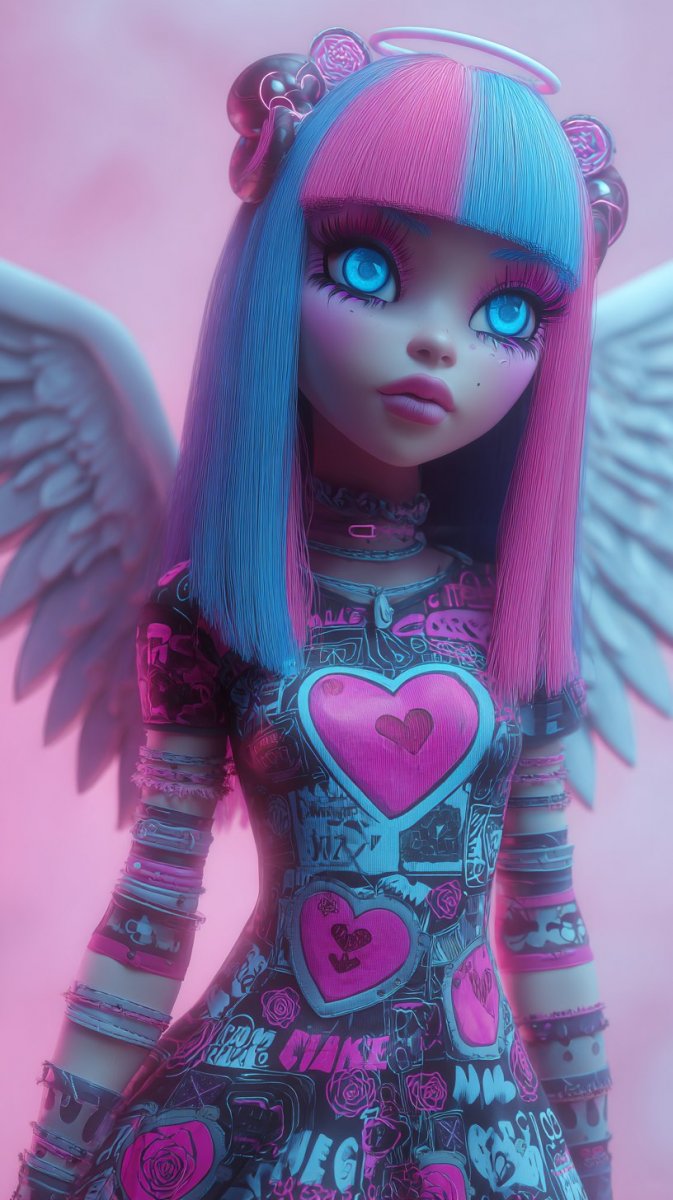 Милая ангел в стиле Monster High с розовыми волосами и голубыми глазами. Генерация из нейросети Midjourney - Midjourney примеры промтов - Форум ИИ о нейросетях - Yes Ai