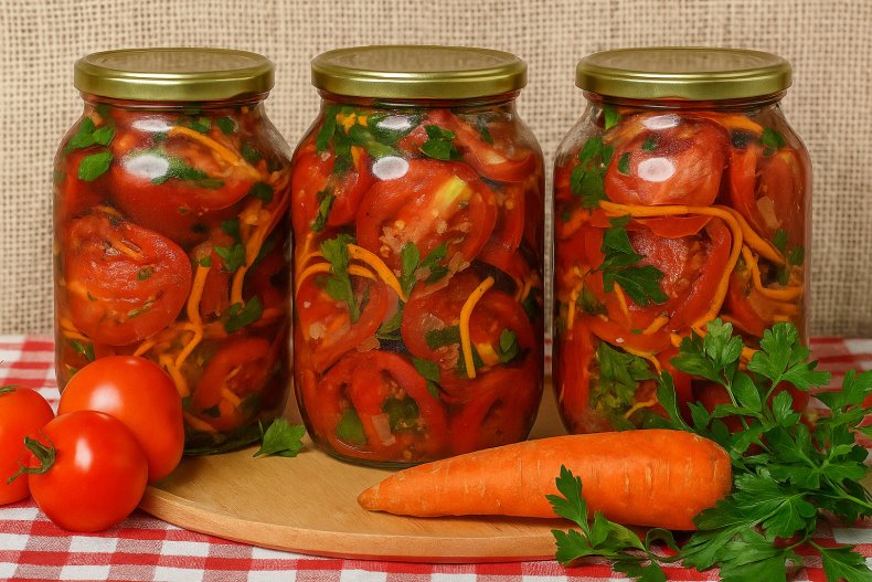 Помидоры по-корейски на зиму. Ингредиенты: - Помидоры 2 кг - Перец болгарский 400 гр - Морковь 250 гр - Лук 150 гр - Чеснок 100 гр - Перец острый 1 шт - Петрушка 2 пучка - Кориандр горошком 1 ч. ложка - Перец черный молотый 1 ч. ложка - Масло растительное 100 мл - Сахар 4 ст. ложки - Соль 2 ст. ложки - Уксус 9% 60 мл