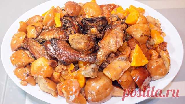 Утка с яблоками, тыквой и сухофруктами, запеченная в духовке