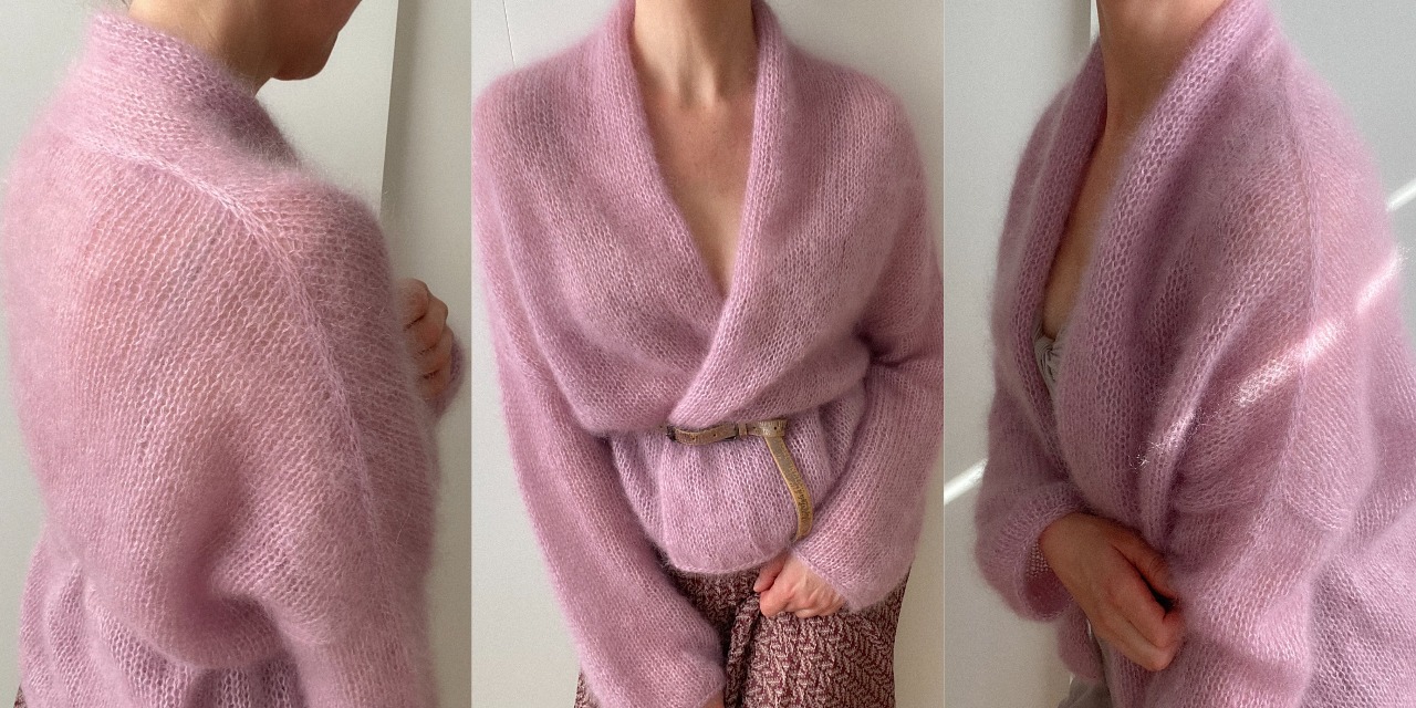Мохеровый кардиган с узким шалевым воротником спицами сверху Marta