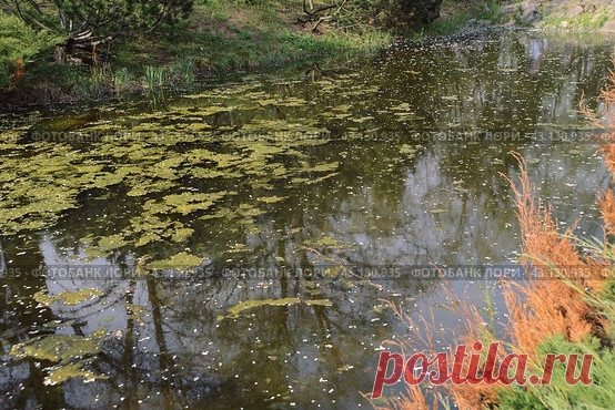 A pond in a park. The water is murky and the reflection of the trees in the water is distorted Стоковое фото, фотограф Ilaronsia / Фотобанк Лори