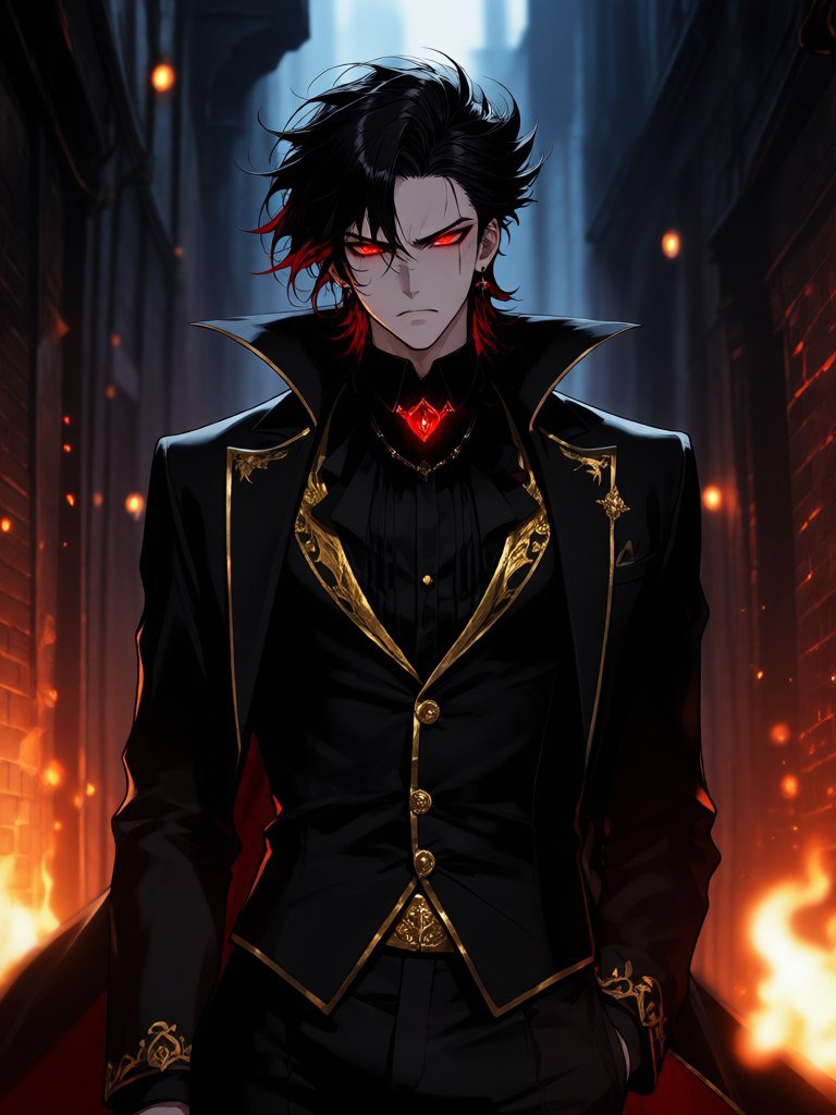 Загадочный вампир в темном переулке с огненными отблесками. Изображение из нейронной сети Qwen Image - Qwen Images примеры промтов - Форум ИИ о нейросетях - Yes Ai