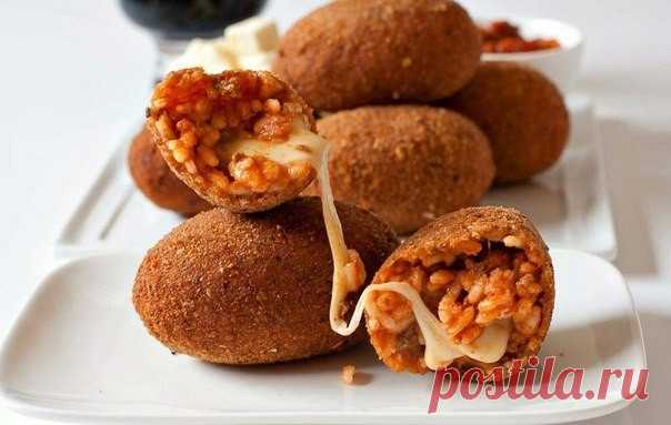Крокеты с сыром (итальянские рисовые шарики) Ингредиенты: Мясной (говяжий) бульон - 1 л Сливочное масло - 80 г Говяжий фарш - 200 г Лук - 1/2 шт Пармезан - 120 г Моцарелла - 200 г Оливковое масло - 2 столовых ложки Томат-паста - 400 мл Соль, перец - по вкусу Рис (для ризотто) - 500...