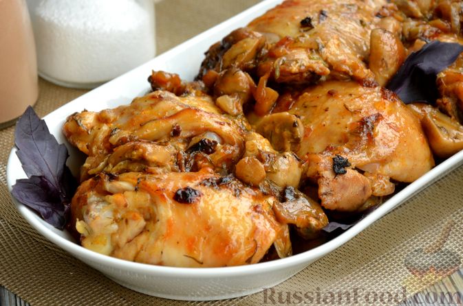 Рецепт: Куриные бёдрышки, запечённые в майонезно-грибном соусе, в рукаве на RussianFood.com