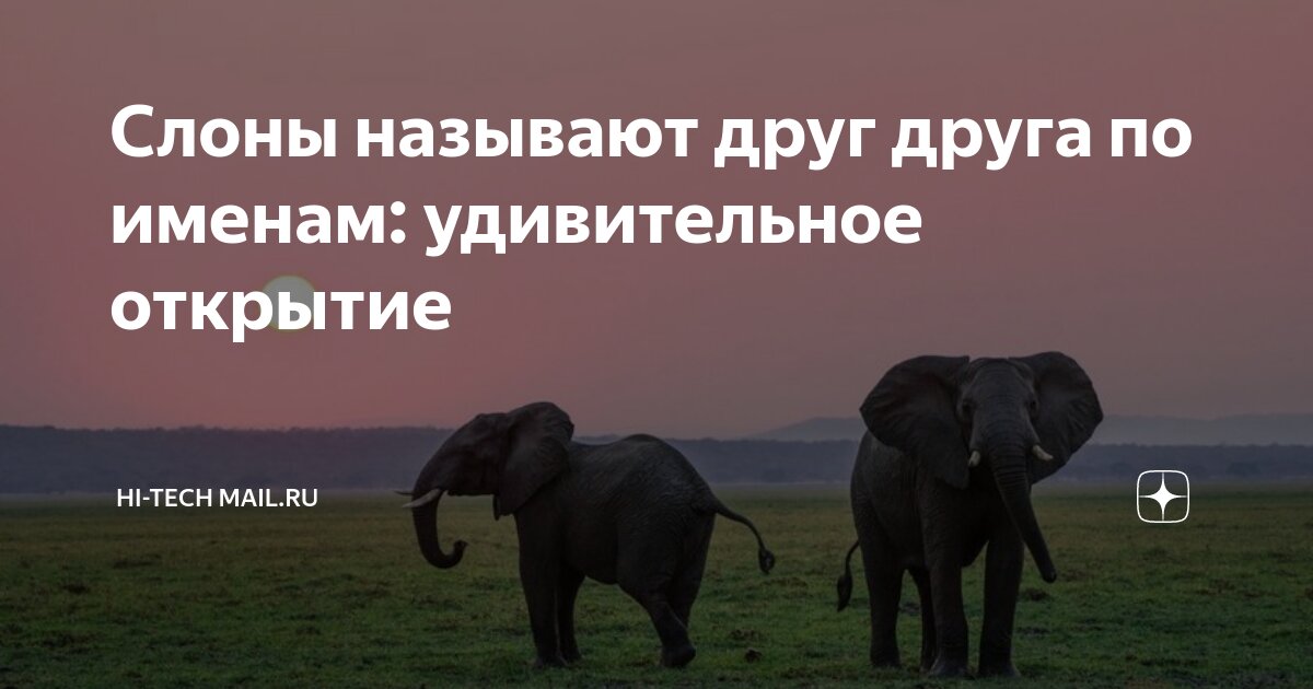Слоны называют друг друга по именам: удивительное открытие Статья автора «Hi-Tech Mail» в Дзене ✍: Ученые выяснили, что слоны, вероятно, оказались единственными животными, кроме людей, которые называют друг друга по именам.
