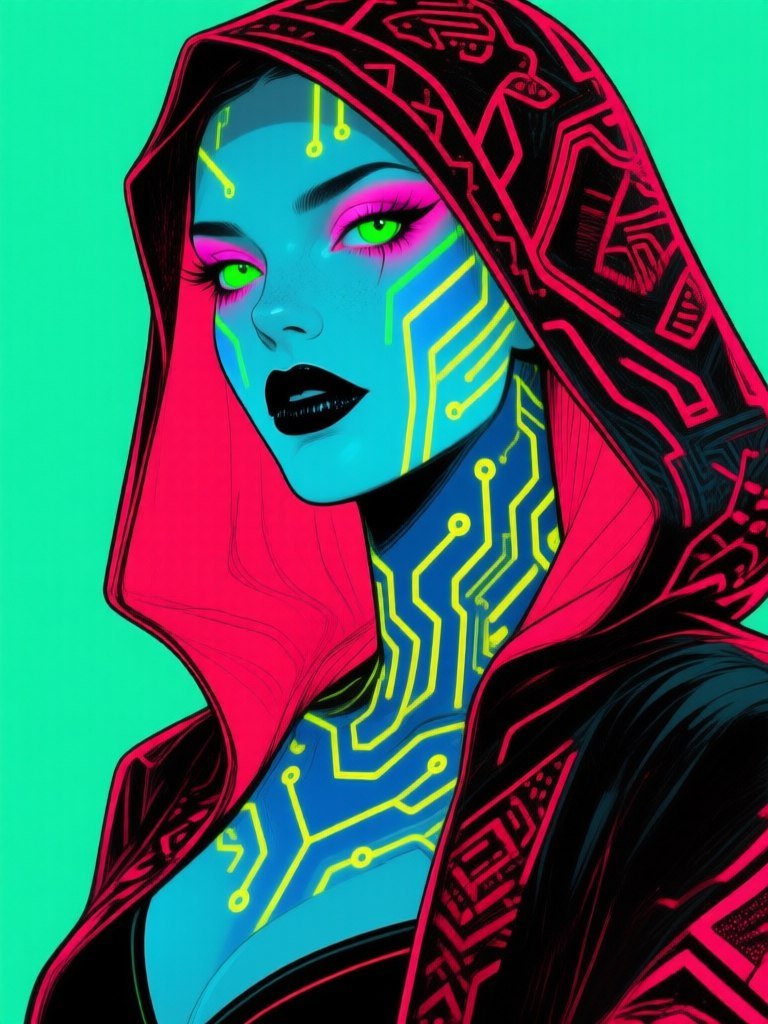 Неоновые глаза и футуристический портрет загадочной женщины. Нейросеть Qwen - Qwen Images примеры промтов - Форум ИИ о нейросетях - Yes Ai