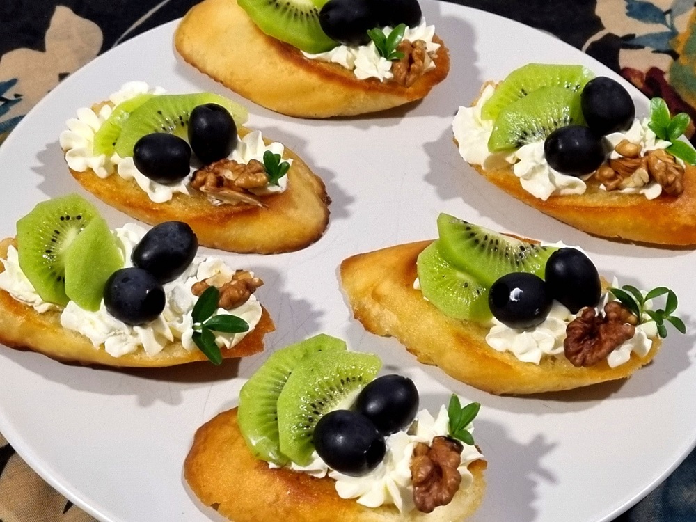 Красиво, вкусно и практично. Отличое начало любого праздничного застолья. Состав: Багет - 1 шт. Киви - 1 шт. Крем сыр - 170 гр. Оливки - 100 гр. Орехи - 3 шт. Растительно масло