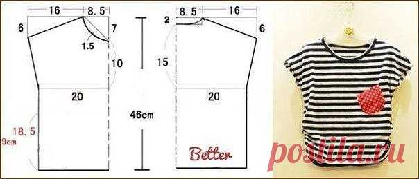 Как сшить футболку Как сшить футболкуФутболка приведена с цельнокроеным рукавом Слева на выкройке - передняя часть со сгибом посередине.Справа - спинка со сгибом посередине.Длина 46 см, объем груди, включая припуски на свободное облегание - 80 см. Ширина плечевого шва - 16 см (при желании можно...