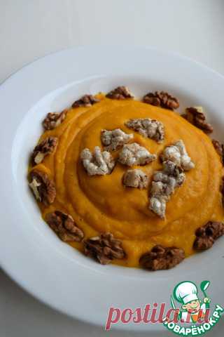 Тыквенный суп с имбирем. Это блюдо представляет собой бархатистый суп-пюре насыщенного оранжевого цвета с легкой пряной ноткой имбиря. При подаче суп украшается орехами и злаковыми хлебцами, которые добавляют хрустящую текстуру и ореховый привкус.