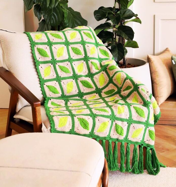 Узкий бежевый плед из квадратных мотивов с лиственным узором
