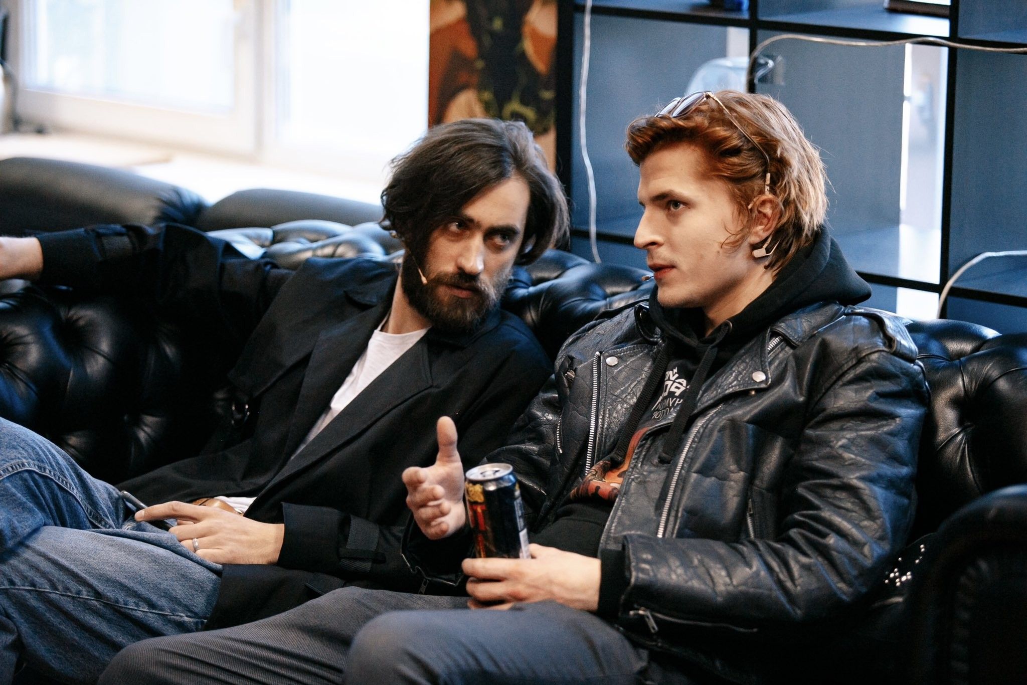 На кожаном диване, облаченном в загадочный полумрак, два человека ведут безмолвный диалог глазами и жестами. Лица окутаны размышлениями о вечности, звучат немые вопросы: куда идет наш мир? Одетые в джинсы и кожаные куртки, они кажутся героями нуара, где каждый взгляд скрывает тайну. В руках банки, как символы современных ритуалов: вкуса неона и городских легенд. Свет из окна касается их волос, делая оттенки медными искрами, а в воздухе повисает аромат кофе и приключений. В этой сцене зависли эхо рок-н-ролльных монологов, где шорох ветра за окном становится шелестом их молчания.