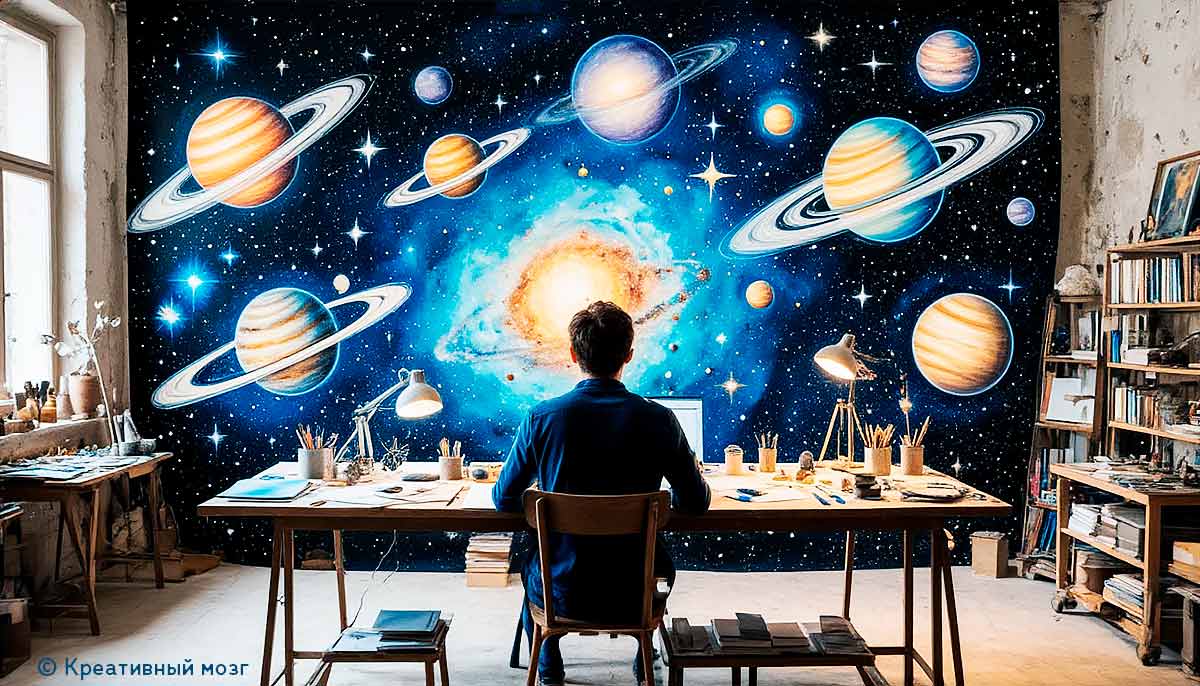 В этой тишине комнаты, напоминающей обитель свободной мысли, человек сидит за столом, окружённый атмосферой загадочного космоса. Стены, расписанные планетами и звёздами, как будто сливаются с мыслительным процессом, расширяя границы обычного воображения. Кажется, художник держит в руках силу сотворения вселенной: его карандаши, кисти и бумаги — это инструменты не материального труда, а полёта фантазии, что проникает за пределы Земли. Солнце на стене манит, словно приглашая к исследованию тайн вселенского масштаба. Потолок теряется в тени, а стены превращаются в бесконечные просторы галактик, где вращаются планеты, такие знакомые и одновременно недосягаемые. В этой обстановке отголоски звёздного шёпота ложатся на бумагу вдохновением, на пределе возможностей человеческого ума.