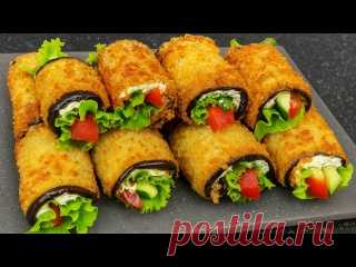 Вкуснейшая закуска из баклажанов — всего из нескольких ингредиентов! 📝 Ингредиенты: Баклажаны – 2 шт Яйца – 2 шт Соль – ½ ч. л. Панировочные сухари – 3–4 ст. л. Масло – 70 мл (для жарки) Огурец – 1 шт Помидор – 1 шт Майонез – 150 г Чеснок – 2 зубчика Листья салата Укроп