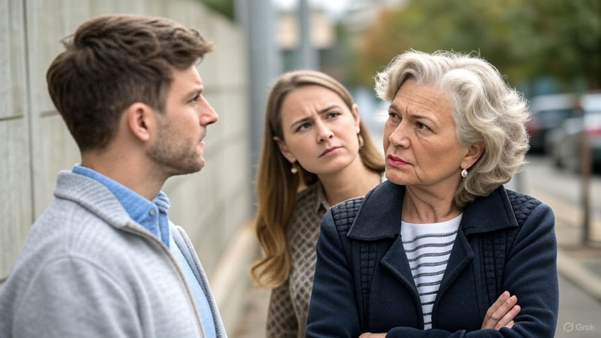 Улица тихо гудела осенним шёпотом, словно пытаясь прочесть мысли трёх людей, случайно встретившихся на фоне бетонной стены, что ограждала их от остального мира. Молодой человек в сером свитере казался пристанищем размышлений: его взгляд устремлён на женщину, чьи волосы серебряным потоком струились по плечам. Она фиксировала этот момент внутреннего диалога, будто пытаясь расшифровать сказанное. Между ними находилась девушка, чьё лицо олицетворяло живую карту эмоций — от недоумения до озарения. Прямо за этой тройкой извивалась дорога, как сюжет романа, который пока не дописан. Здесь каждый момент — эпическая глава в книге будничной жизни. Светлеющие облака над городом словно мерцают тысячами невидимых секретов, а голоса улицы шуршат, пробуждая воспоминания чужих разговоров.