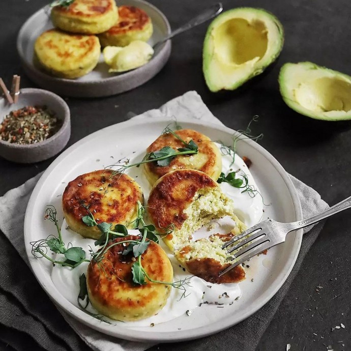 Сырники с авокадо Ингредиенты: Авокадо — 90 г Творог — 300 г Яйцо — 1 шт. Соль — 1 щепотка Мука — 50 г Мука — для формовки Специи/травы — 1 ч. л.Приготовление:1. Авокадо размять вилкой, растереть с творогом и яйцом. 2. Всыпать к...