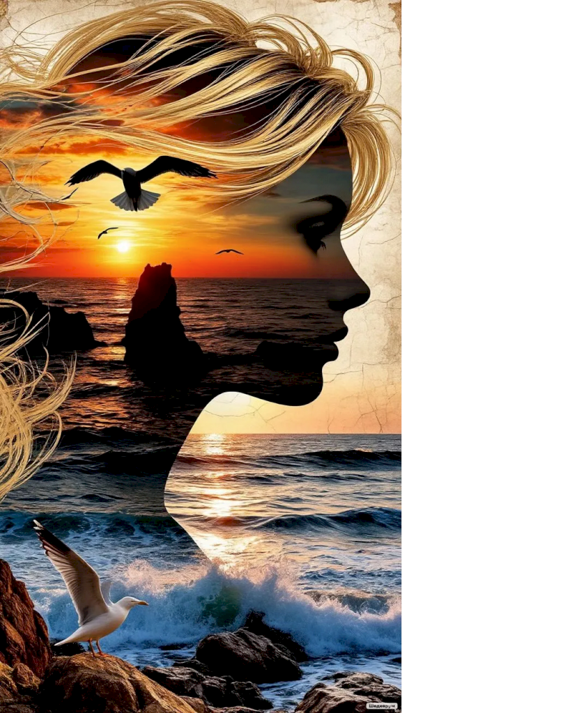Ветры заката скользят по золотым волосам, сплетают их с небом и морем. Лицо женщины, словно вырезанное из горизонта, где солнце, едва дыша, погружается в океан, оживает в этой картине. Птицы парят в воздушных потоках, оставляя свои истории на хрупкой бумаге небес. Волны под ногами чайки сбегают в вечность, шумят о давно забытых временах. Здесь всё дышит тишиной, где каждый элемент пляшет в своих тактах. Волосы девушки, словно нити мира, вплетаются в ритм заката, несут в себе шёпот моря, тихую музыку ветра, рассказывают о том, что скрыто от глаз — о тайнах, изменяющих бытие. Этот мир — палитра, где художником выступает сама природа, не знающая границ. В этом маленьком кусочке вечности скрыта вся мудрость, которой учит природа. То, что остаётся незримым, становится частью вечного танца света и тени, моря и неба, человека и природы.
