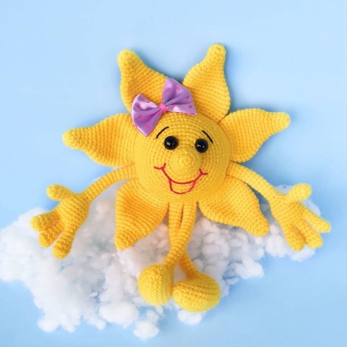 На ясном небосводе, в сказочном пространстве, из облаков мягкой ваты выкатывается улыбающееся солнце. Оно сплело себя из нитей добрых помыслов и детских мечтаний. Златовласое, с розовато-лавандовым бантом на макушке, оно словно героиня из детской книги, где все вокруг живое и носит яркие краски. Этот теплолучник тянется к нам, предлагая прикоснуться к его радости, словно ребёнок, выкатывающийся завершивший вышивку ковёр счастья. Это солнце — не просто символ светлого дня, но и воплощение заветных надежд. Лица людей внизу поднимаются в тёплой ответной улыбке, собирая в себе утреннюю росу. И порой кажется, что выражение этого вязаного чуда шепчет о безграничной радости жить, напоминая о сказочном мире, где всё возможно.