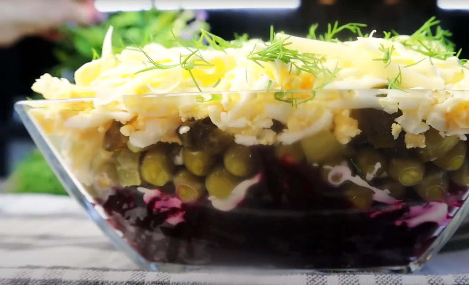 Слоёный салат со свёклой и огурцами: простой рецепт с неожиданным вкусом Ингредиенты свекла — 2 штуки (средние, запечённые или отварные) яйца — 4 штуки квашеные огурцы — 3-4 штуки сыр твёрдый — 150 г консервированный зелёный горошек — банка чеснок...