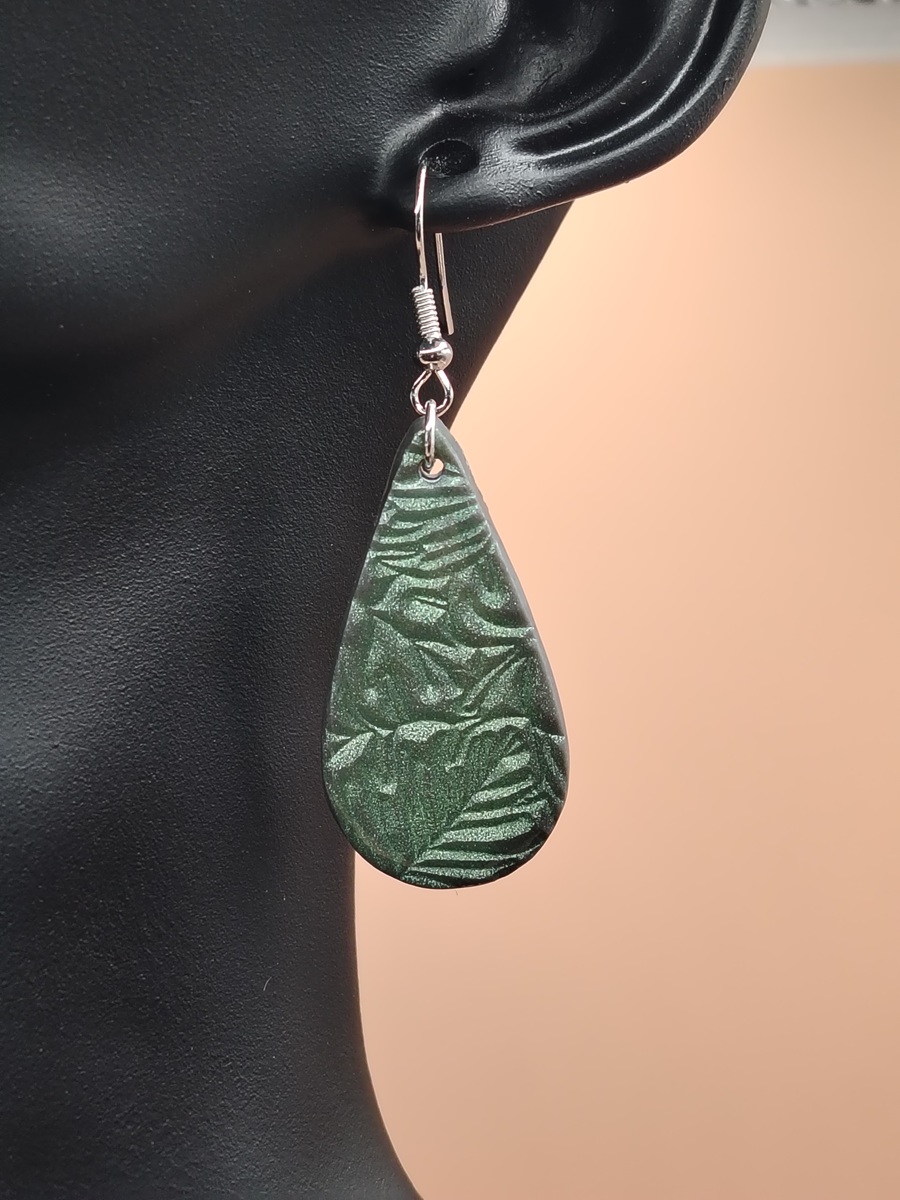 Серьги из полимерной глины и эпоксидной смолы ручной работы. Текстура рисунка - листья монстеры.