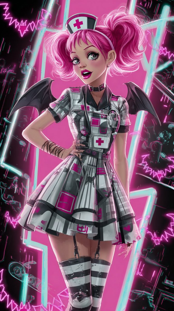 Готическая медсестра в стиле Монстер Хай: розовые волосы и яркий наряд. Изображение из нейросети Midjourney - Midjourney примеры промтов - Форум ИИ о нейросетях - Yes Ai