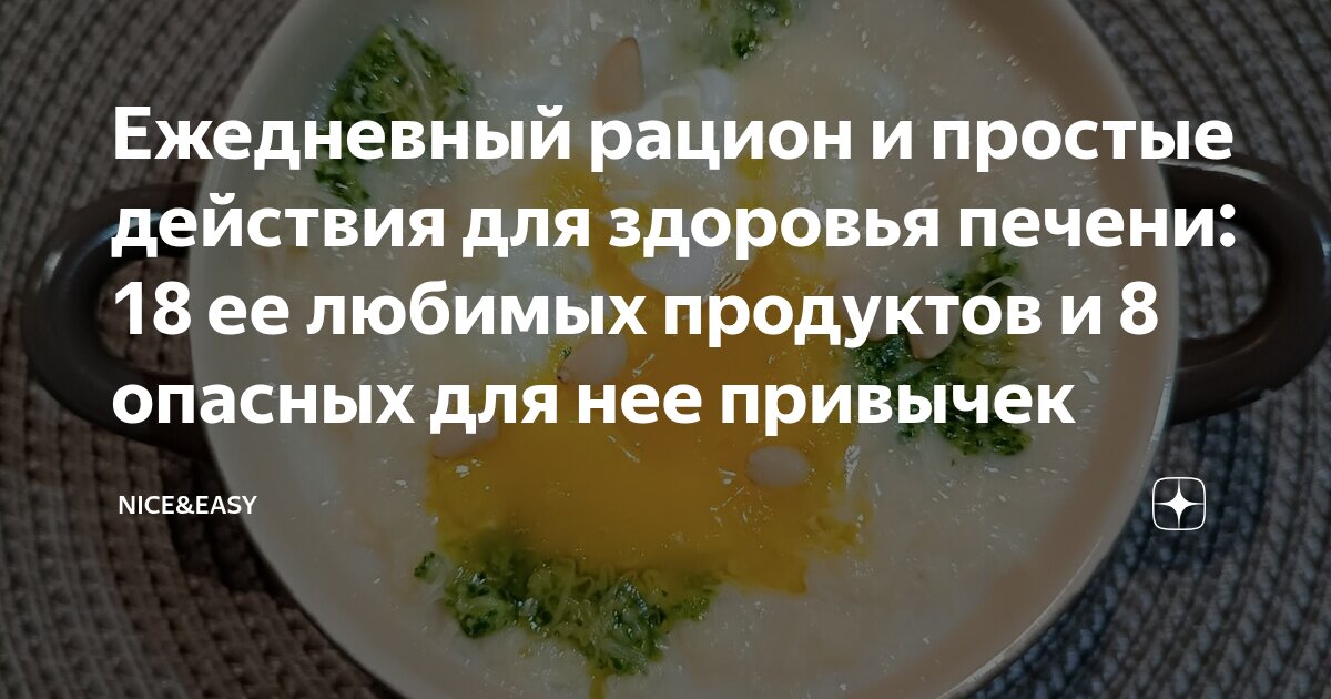 Ежедневный рацион и простые действия для здоровья печени: 18 ее любимых продуктов и 8 опасных для нее привычек Статья автора «Nice&Easy» в Дзене ✍: Всем привет! Сочувствуете ли вы печени так, как сочувствую ей я?