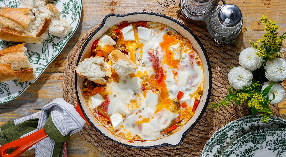 - РЕЦЕПТ ПРИГОТОВЛЕНИЯ Негаснущий экран Нажмите, чтобы экран не гас, пока вы готовите. Экран вернется в привычный режим, когда вы покинете страницу или отключите функцию Шаг 1 Вымойте и обсушите салфетками перец и помидоры. Удалите у стручков перца плодоножки. Разрежьте зеленый перец цицак на четвертинки вдоль. Перец чили — вдоль пополам, половинку красного перца — на дольки. Нарежьте все виды перца мелкой соломкой. Менемен - турецкий омлет (gastronom.ru) Шаг 2 Помидоры разрежьте вдоль пополам и натрите мякоть на крупной терке, держа помидор со стороны кожицы. Так она останется у вас в руке. Это удобный и быстрый способ получения пюре из помидоров без кожицы. Менемен - турецкий омлет (gastronom.ru) Шаг 3 Разогрейте толстостенную сковороду, лучше чугунную, диаметром 22–24 см на среднем огне. Добавьте оливковое масло. Всыпьте нарезанный перец и обжаривайте, помешивая, около 3 минут. Менемен - турецкий омлет (gastronom.ru) Шаг 4 Добавьте в сковороду к перцу сливочное масло. После того, как оно растопится, жарьте перец еще 40–60 секунд, активно помешивая, затем влейте в сковороду пюре из помидоров. Менемен - турецкий омлет (gastronom.ru) Шаг 5 Доведите до кипения и уваривайте пюре около 5 минут, пока лишняя жидкость не испарится и пюре не сменит цвет на более густой. Приправьте соус солью, свежемолотым черным перцем и хлопьями чили по вкусу. Менемен - турецкий омлет (gastronom.ru) Шаг 6 Раскрошите фету на не слишком мелкие комочки и добавьте ее в сковороду к томатной смеси, перемешайте, чтобы сыр равномерно распределился, и прогрейте еще минуту. Менемен - турецкий омлет (gastronom.ru) Шаг 7 По одному разбейте в сковороду предварительно вымытые и обсушенные яйца. Деревянной лопаточкой раздавите желтки и медленно перемешивая, распределите яйца по всей смеси, не превращая их в единую массу, так чтобы были заметны застывшие пятна белков — это красиво. Менемен - турецкий омлет (gastronom.ru) Шаг 8 Выждите полминуты, чтобы яйца схватились, затем проверьте их состояние, аккуратно вороша содержимое сковороды лопаточкой, но не перемешивая грубо. Яйца не должны перевариться. Менемен - турецкий омлет (gastronom.ru) Шаг 9 Подавайте турецкий омлет менемен на сковороде, сопроводив его белым хлебом. Менемен принято есть, обмакивая в него кусочки хлеба. Но если вы хотите есть вилкой, никто вас не осудит. Менемен - турецкий омлет (gastronom.ru)