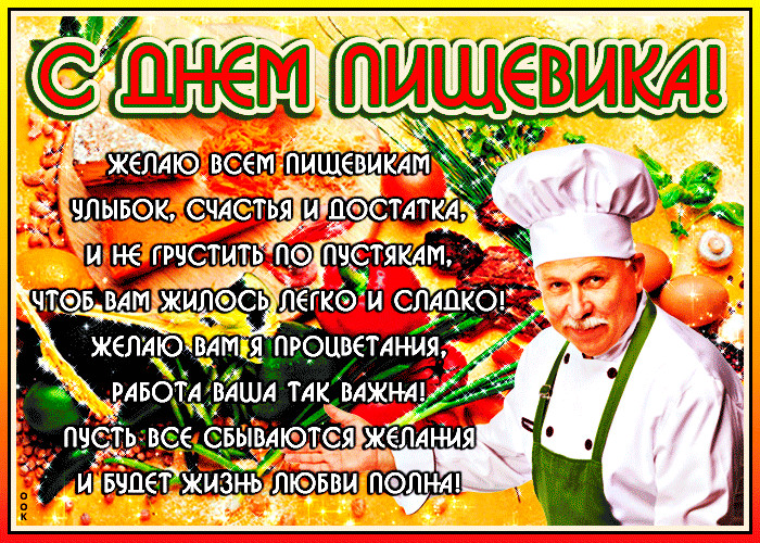 В этот день мы поставим на стол, Все к чему руки вы приложили, Вы промышленности пищевой Жизнь свою навсегда посвятили. Открытки на День работников пищевой промышленности!