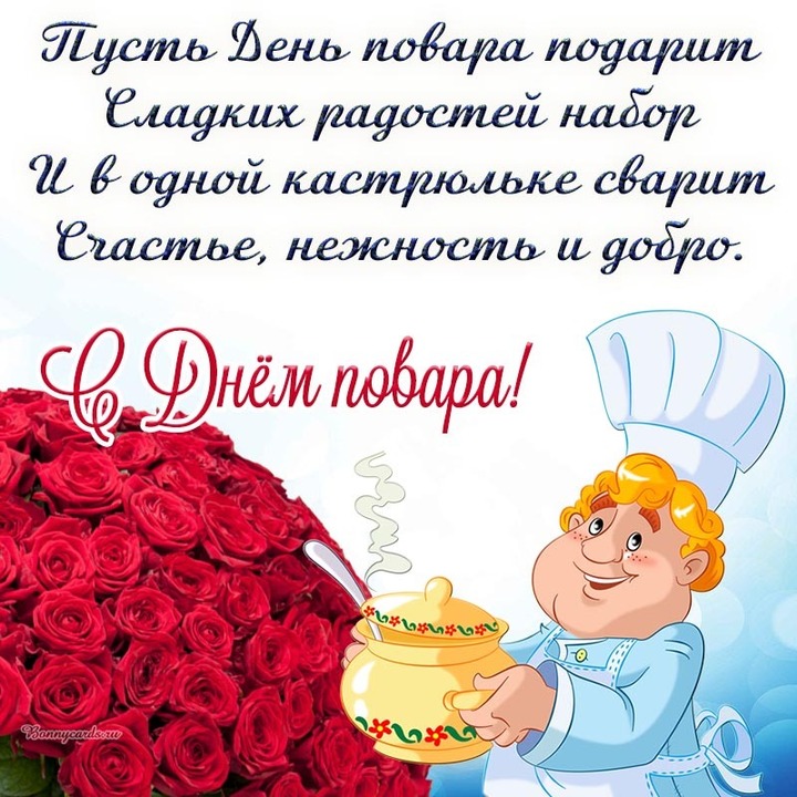 Сегодня праздник поваров,Нет в мире лучше мастеров,Готовят всё они с душой:И щи, и борщ, и суп с лапшой. Открытки на День повара!
